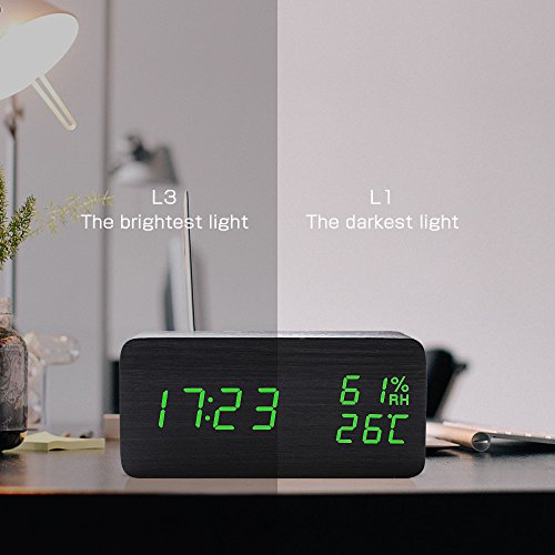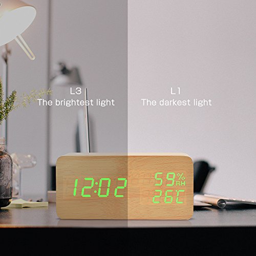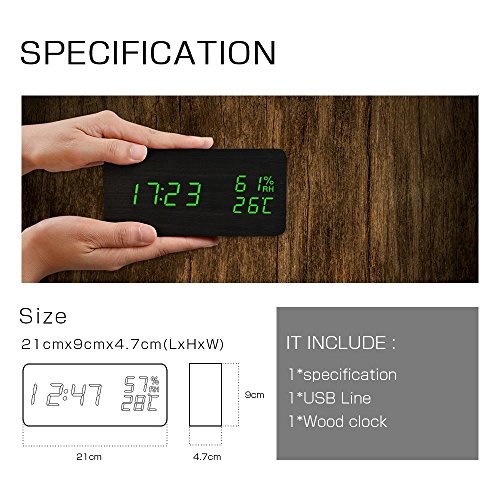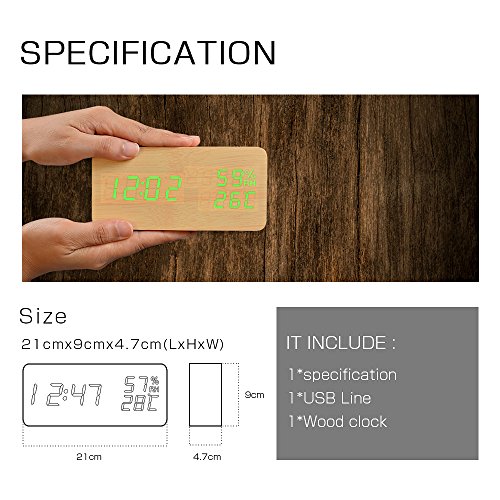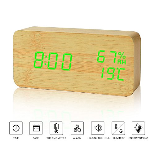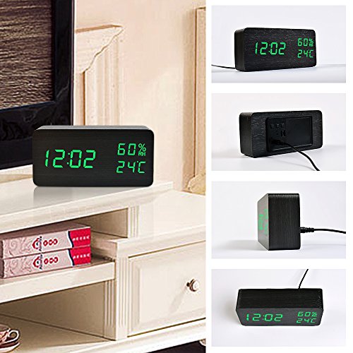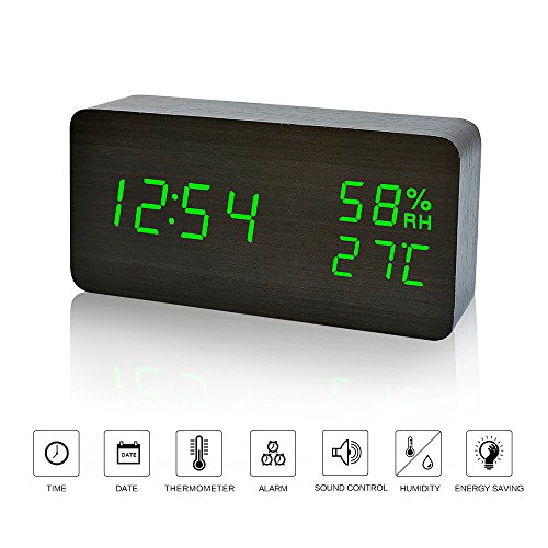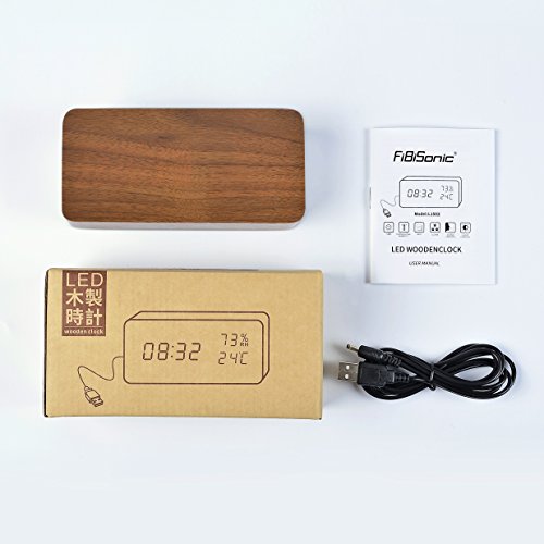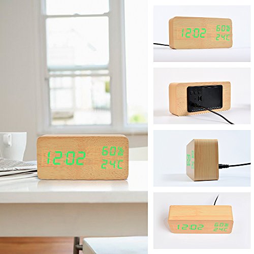 Led Clock---FiBiSonic Wood Digital Clock Small Green Led Clock, Displays Time Date And Temperature,Silent Modern Style Alarm Clock with Thermometer and Hygrometer, Gift for Friends/Families