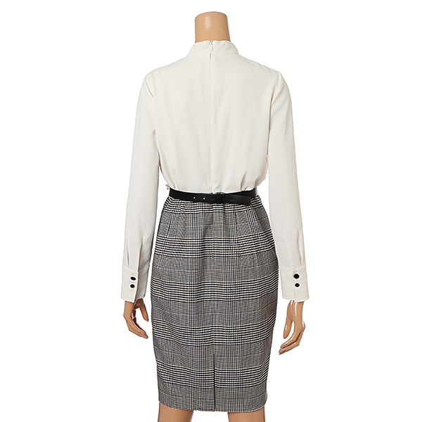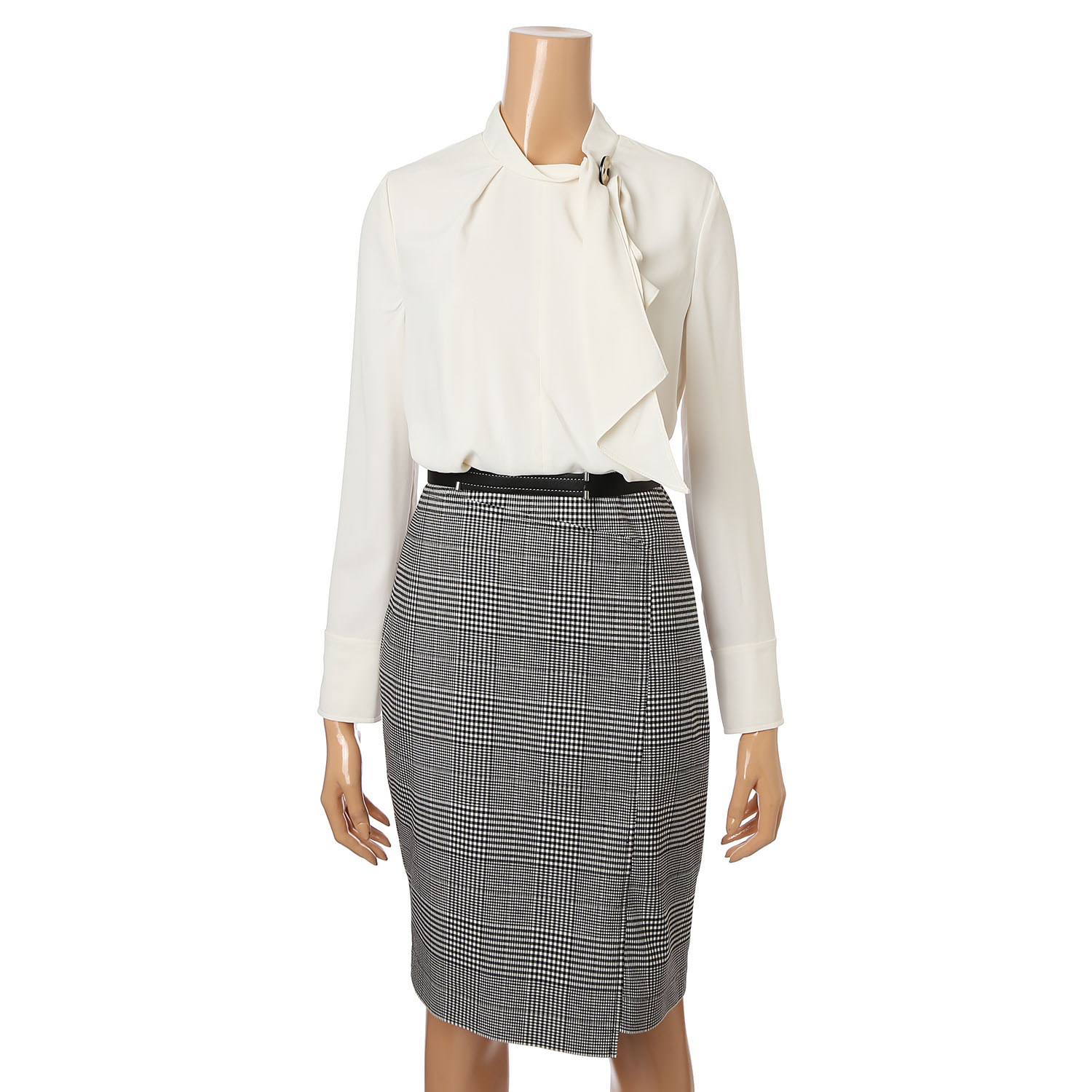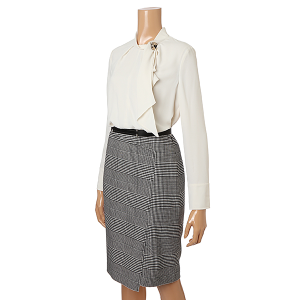 무지 블라우스에 체크 패턴 스커트가 더해진 디자인으로 단품만으로 완성도 높은 코디를 연출할 수 있습니다.