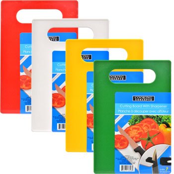 - These colorful cutting boards are a kitchen necessity! Comes in a variety of colors, plus each board has a convenient knife sharpener to prevent dull blades and uneven cuts.