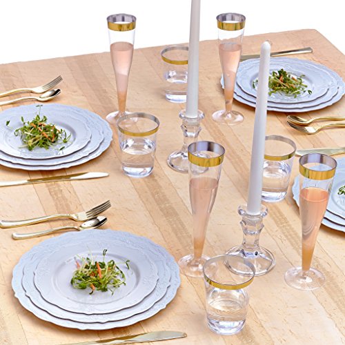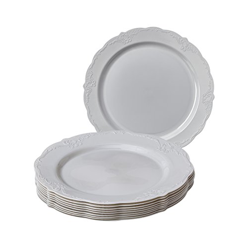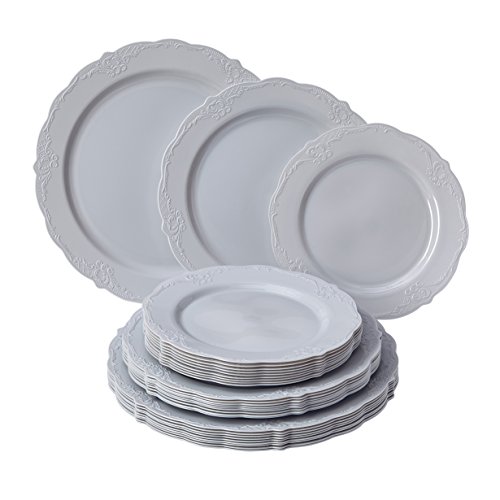 - PREMIUM GRADE MATERIAL: The Vintage collection is Eco-disposable and is made from the finest compostable plastic material. The set includes 10X 10.25” diameter dinner plate, 10X 9” diameter salad plates, and 10X 7.5” diameter dessert plates. They are made from top-notch quality, BPA-free plastic material which makes the disposable plates super resistant to bending and makes carrying lots of food items a breeze.