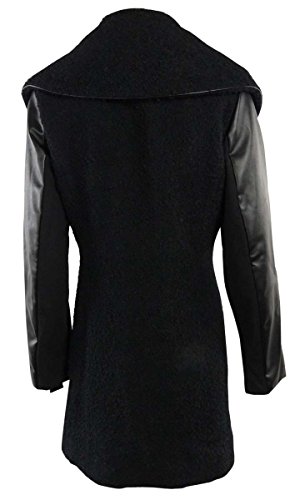 Coat features full lining, shawl collar, wool blend shell, faux leather sleeves, front pockets, and six button front closure.