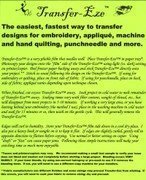 [Description] The easiest_ fastest way to transfer designs for embroidery_ applique_ quilting_ punchneedle and more. A very pliable_ water soluble film that needles well. Try it with cross stitch. Photocopy or print your designs on teh ``film`` side. Peel freezer paper backing away and stick Transfer-Eze directly onto your project. After all needlework is finished_ cut excess away and soak or rinse project w/cold water to dissolve film.