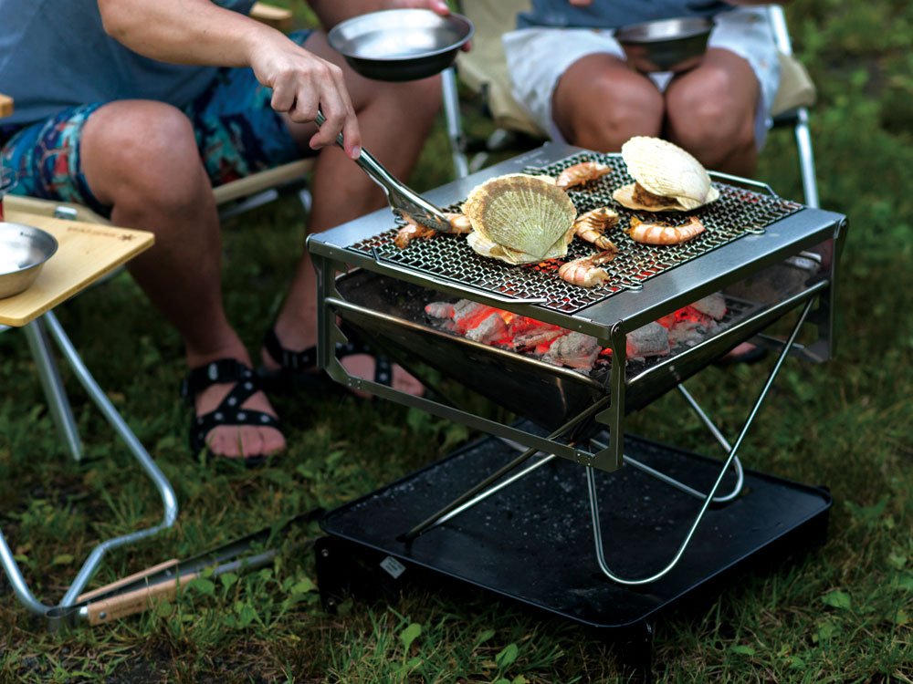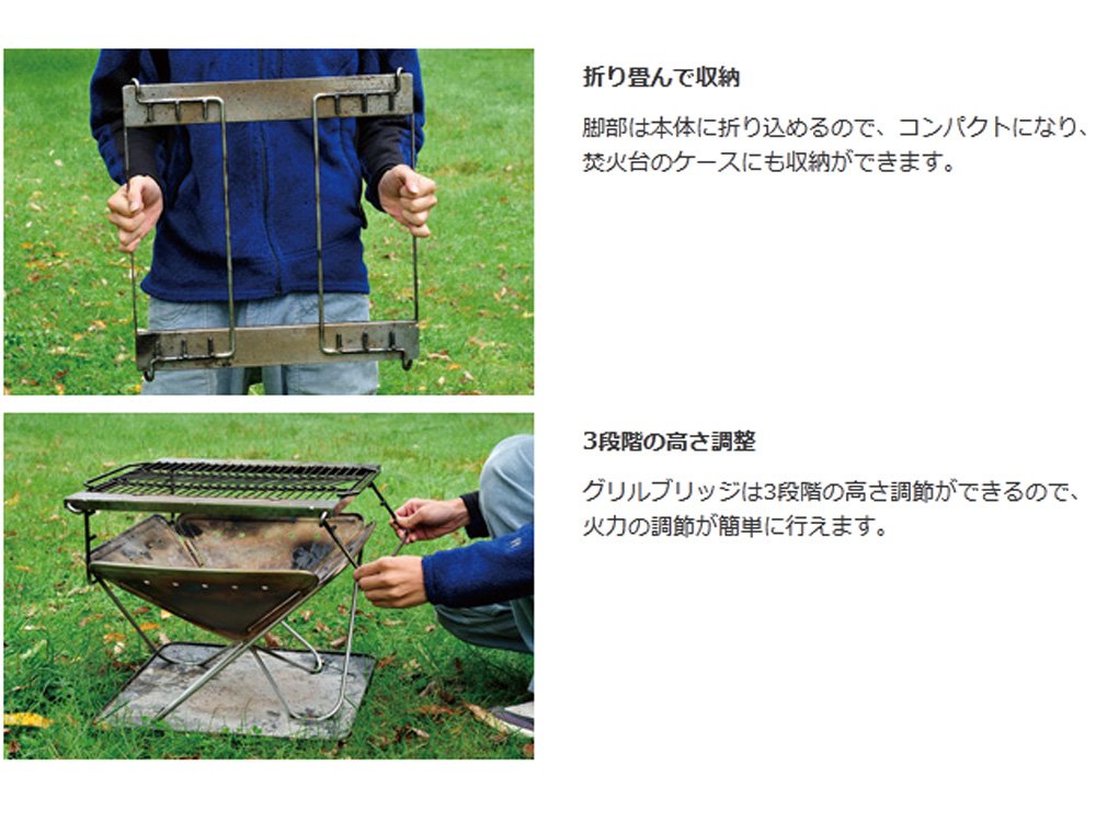 By setting the grill bridge L on the fire base stand L, you can use cooking options such as grill net and grill plate.