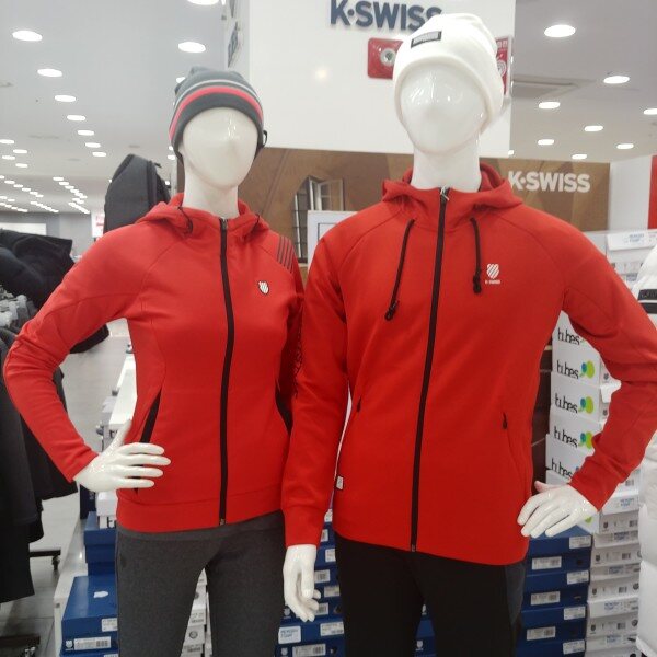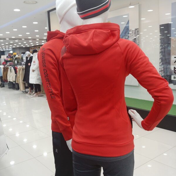 강렬한 레드빛이 단번에 시선을 사로잡는,편안한원단의 후드 집업.