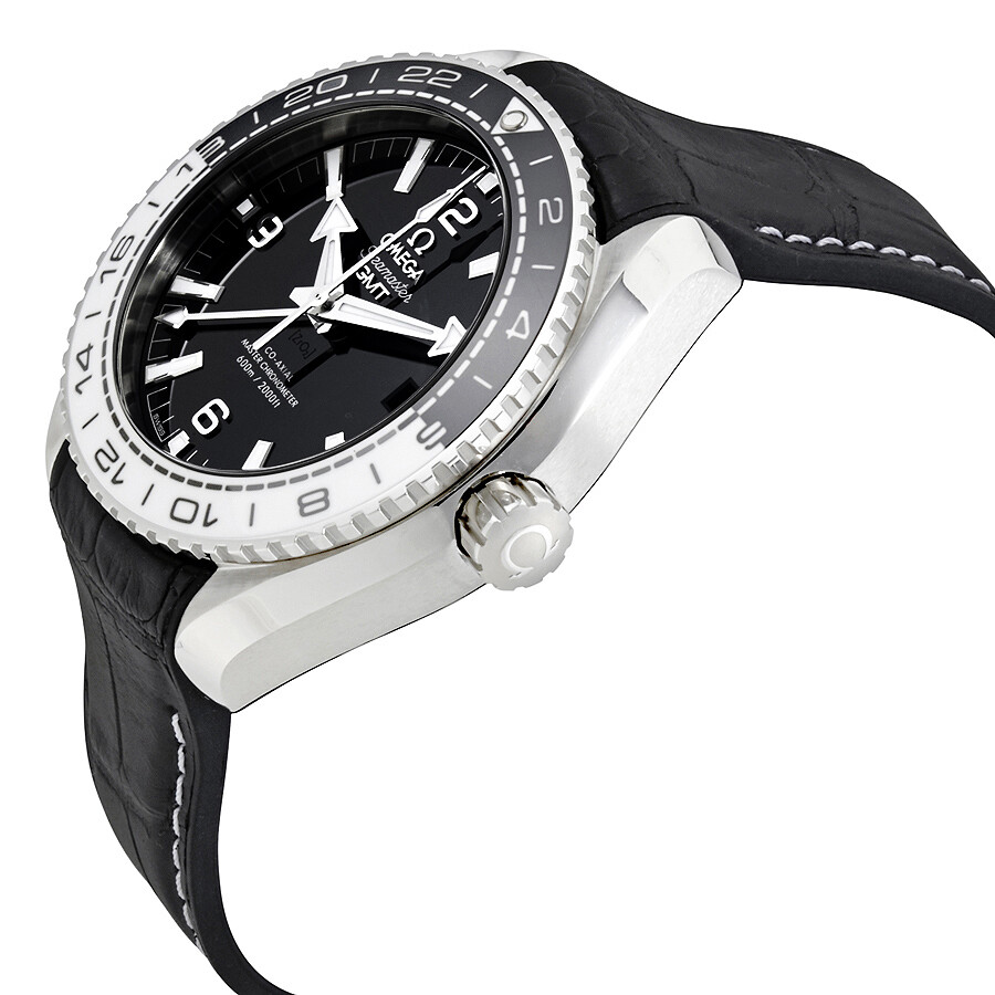 Stainless steel case with a black leather with rubber lining strap. Uni-directional rotating bezel. Black dial with silver-tone hands and index- Arabic numerals hour markers. Dial Type: Analog. Luminescent hands and markers. Date display at the 3 o''clock position. Omega Calibre 8906 automatic movement with about 60 hours of power reserve. Scratch resistant sapphire crystal. Screw down crown. Skeleton transparent exhibition see through case back. Case size: 43.5 mm. Round case shape. Water resistant at 600 meters / 2000 feet. Functions: GMT, second time zone, hour, minute, second. Luxury watch style. Watch label: Swiss Made. Omega Seamaster Planet Ocean Automatic Mens Watch 215.33.44.22.01.001.