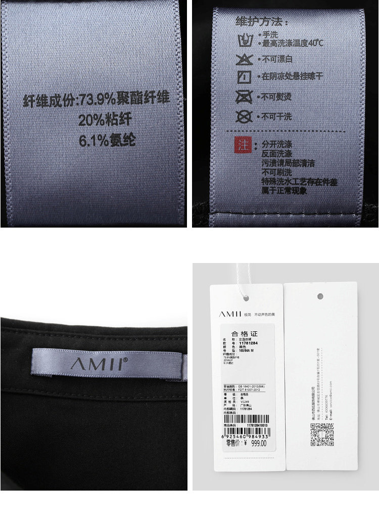 洗涤标准:不可浸泡不可漂白110℃以下垫布熨烫悬挂晾干40℃以下手洗不可干洗