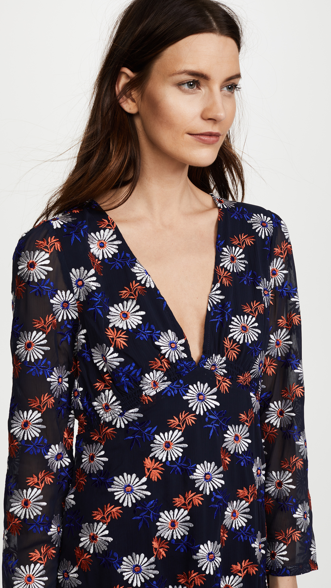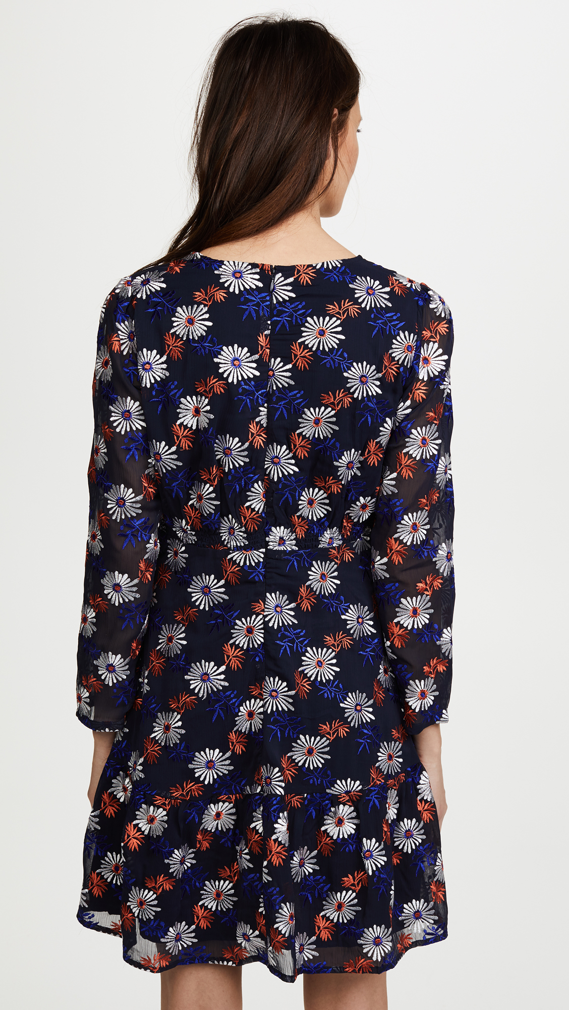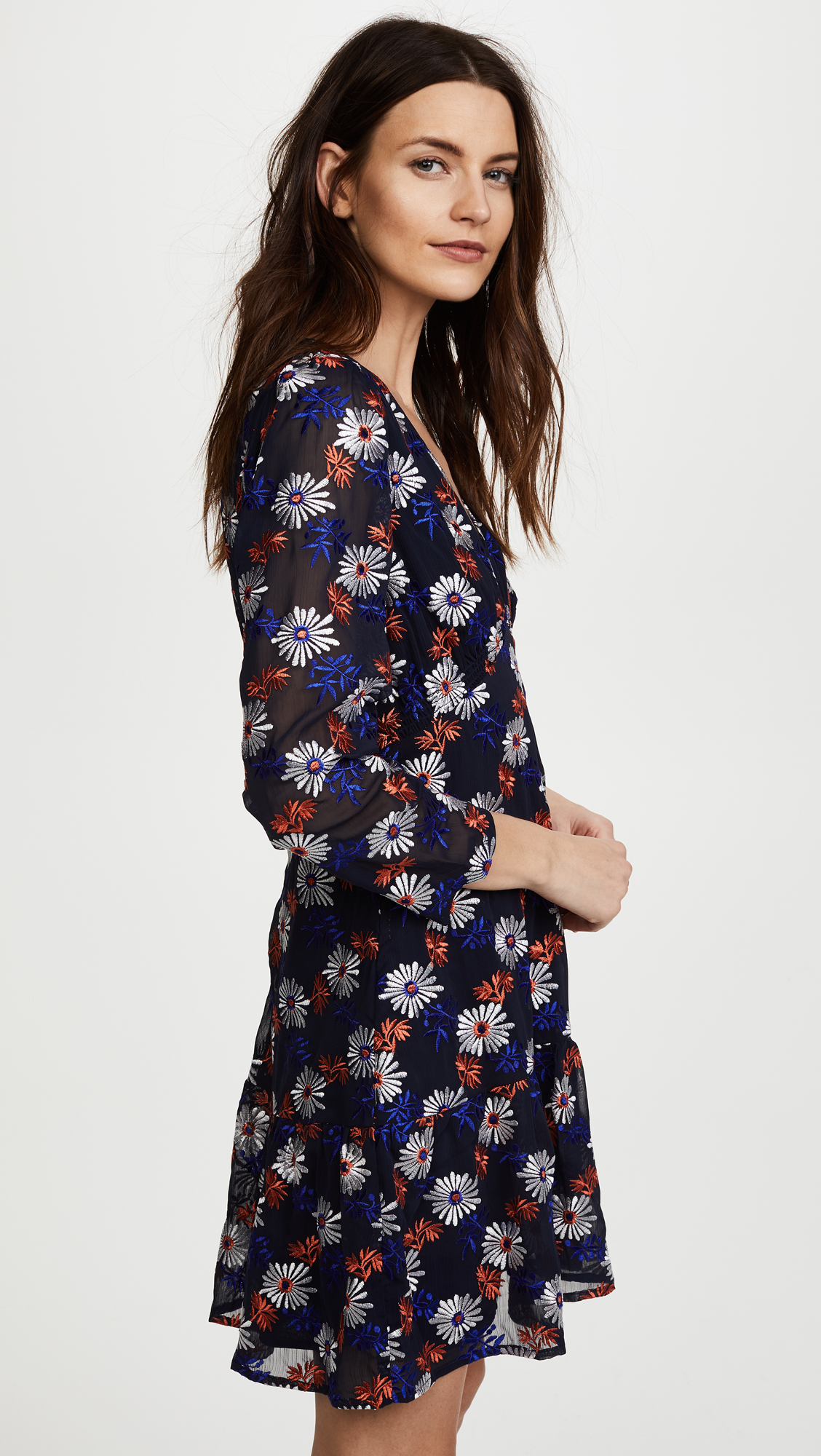 Fabric: Crinkled chiffon Floral embroidery A-line silhouette Mini dress cut V neck Long sleeves Hook-and-eye at back Hidden zip at back Lined Shell: 100% polyester Lining: 100% rayon Dry clean Imported, China Style #ELLAM41371