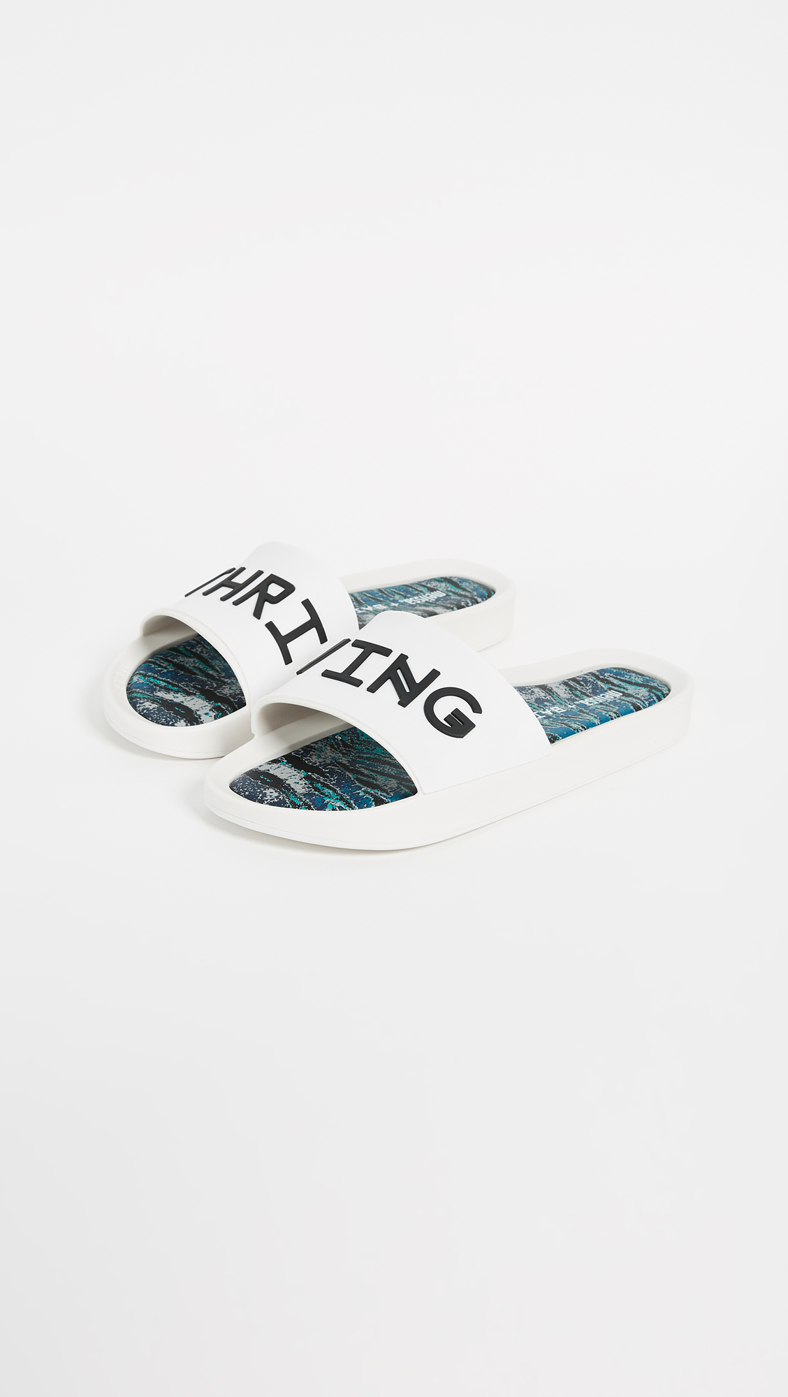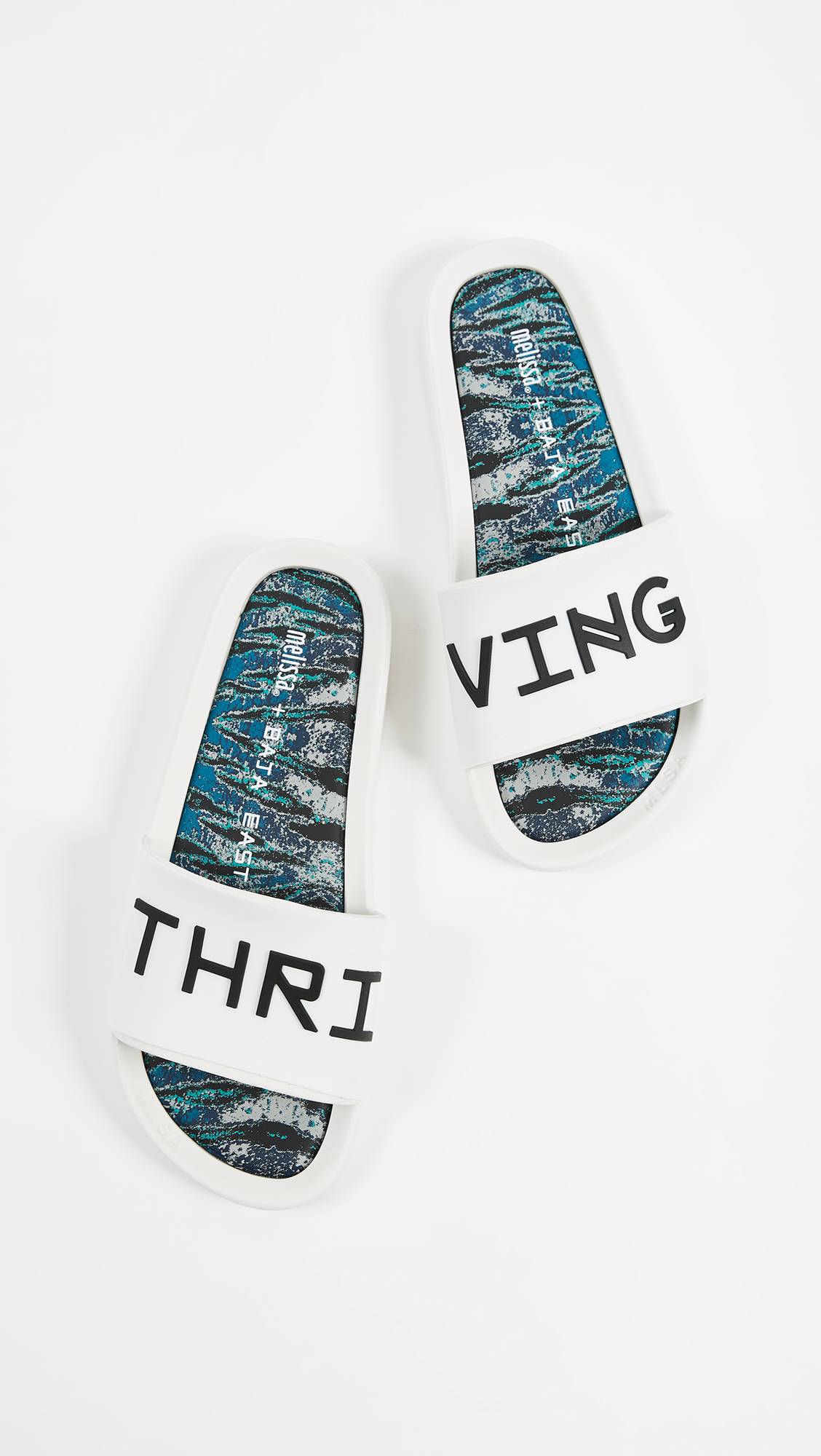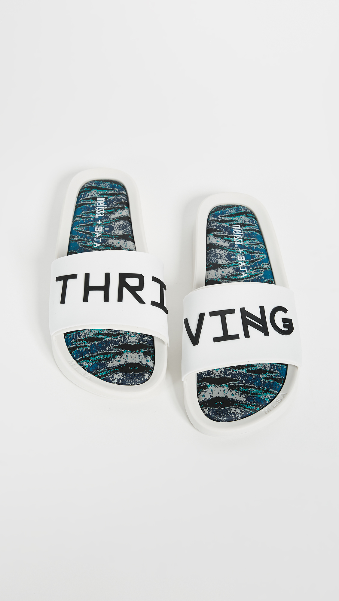 Fabric: Rubber Multicolor, abstract print at cushioned footbeds ''THRIVING'' script when worn together Bubblegum scent Slide sandals Flat profile Open toe Rubber sole Imported, Brazil This item cannot be gift-boxed Style #MELIS20327
