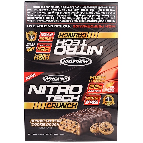 Muscletech, Nitro Tech Crunch Bars, Chocolate Chip Cookie Dough, 12 Bars, 2.29 oz (65 g) Each