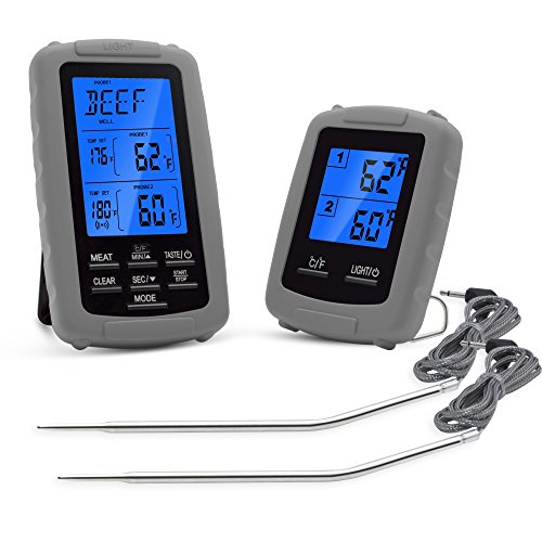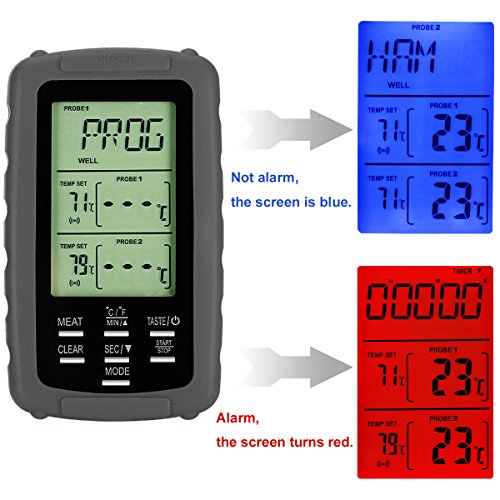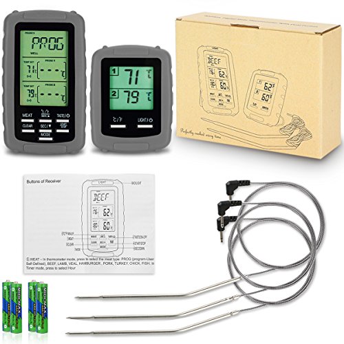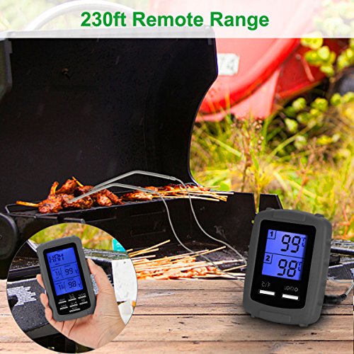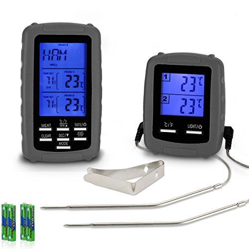 The main technical parameters: 1.Wireless transmission distance: up to 230ft (70 meters) 2.Dual probe temperature display 3.Probes and leads can withstand temperatures up to 716 ° F (380 ° C) and comply with IPX7 waterproofing standards 4.Alarm function 5. ℃ / ℉ temperature display unit selection 6.Temperature range: -20 ℃ ~ 300 ℃ (-4 ~ 572 ℉) 7.9 hours 59 minutes 59 seconds Countdown timer 8. Backlight automatically shut down after 10 seconds, without any operation