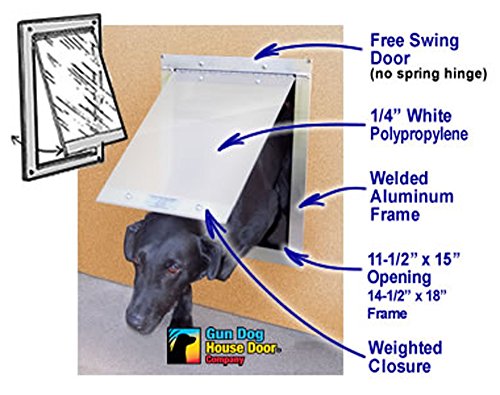 Studio : Gun Dog Publisher : Gun Dog Binding : Misc. Product Description As your dog goes in or out through the pet door, the inner panel swings freely on its' hinge to allow easy access. Close tolerances mean less air infiltration than other free-swinging pet doors. Two-Way Dog Door Design. FREE SWING DOOR. No spring-hinge. Recommended for dogs that are timid, arthritic, or old, and if you need a silent operating dog door. Aluminum Frame. Weighted closure to self shut. Hardware Included: only 4 screws required Installation Size: 12 1/2" x 17 1/4" opening. Dog Door Frame Size: 14" x 18" Dog Door Opening Size: 11" x 14 1/2". Optional Close-Off Panel available separately. Made in the USA. 0