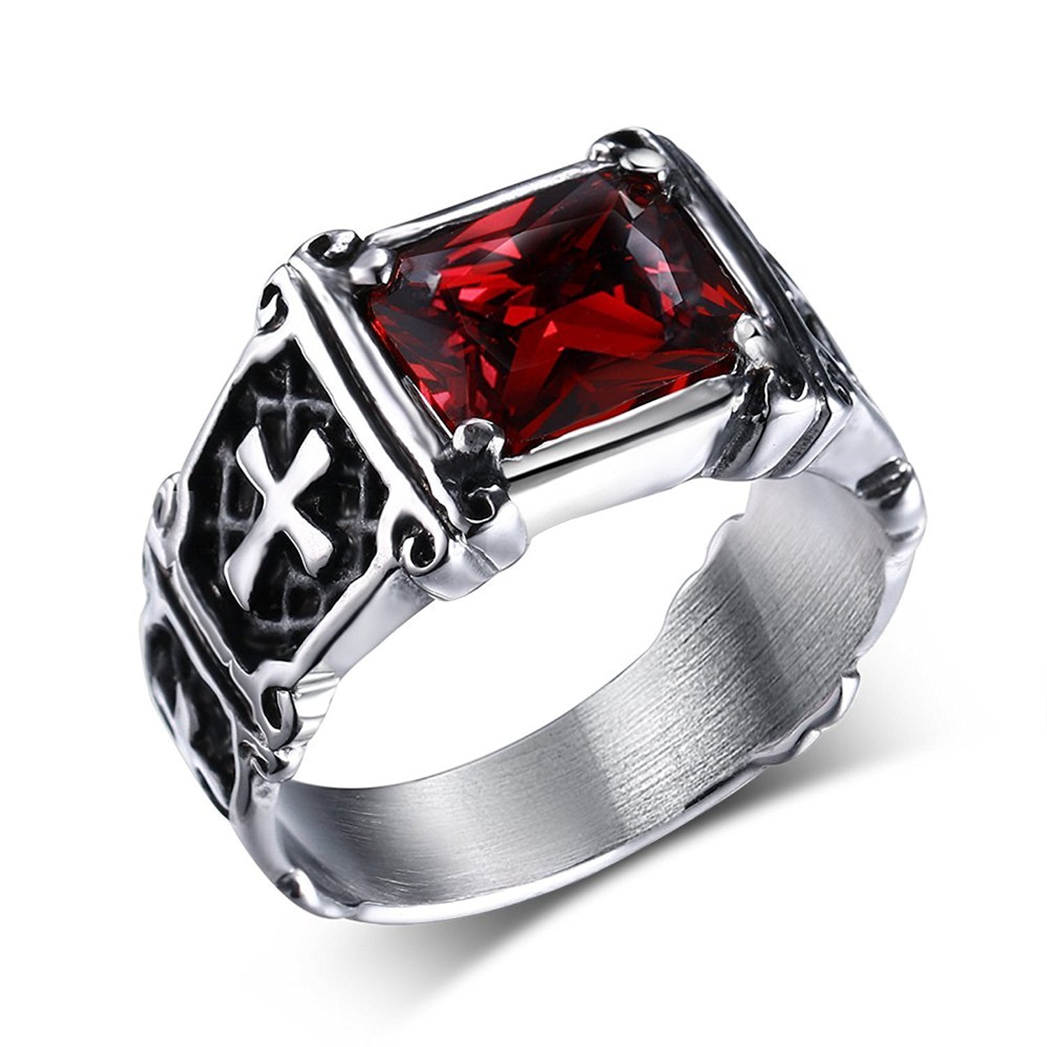 It is a unique and lovely design men's stainless steel ring set in a rugged design ring of cross pattern with a red gem stone color cubic zirconia stone that looks like ruby.