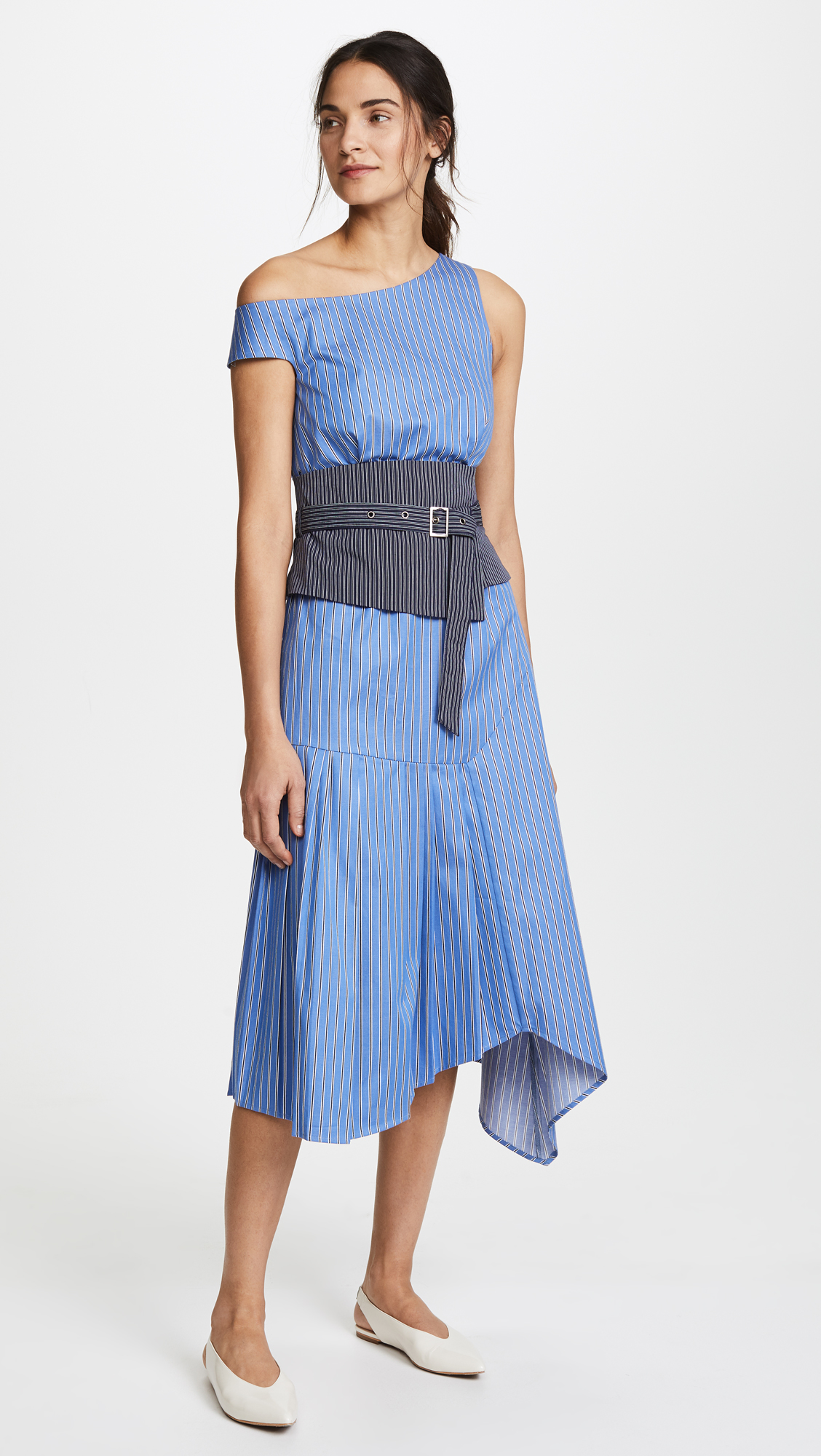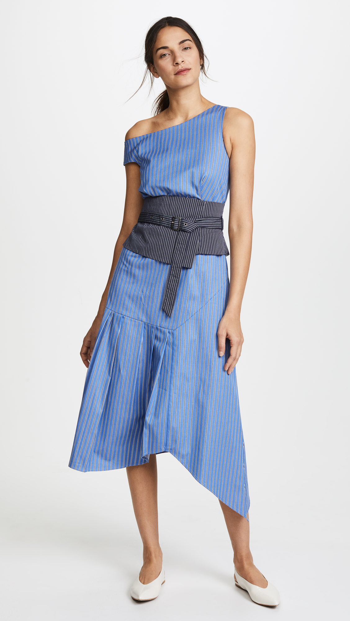 Fabric: Shirting Striped print A-line silhouette Midi length One-shoulder neckline Short sleeve Self-belt at waist Hidden zip at back Shell: 100% cotton Dry clean Made in the USA Style #SEAAA20726