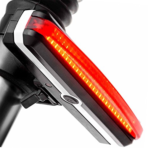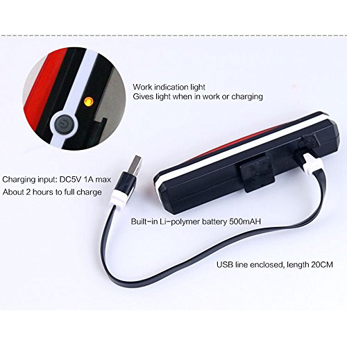 -. Feature : ▲6 LIGHT MODES: Adjust the power of the light beam to your needs and ride in any weather / ▲USB RECHARGEABLE TAIL BICYCLE LIGHT: You can charge your bicycle light anywhere anytime, which will save time and avoid inconvenience. / ▲WATERPROOF: water resistant according to IPx4. It will not be influenced by any rainy day. / ▲EASY TO INSTALL: The material of the bandage is silical gel, fits any sized seat post or bike frame . this light can be strapped on many things, such as the helmet, backpack, bike or even the pet's collar. / ▲MORE SAFETY: The high brightness COB LED light helps the eye-cating widely. This taillight guarantees you a safe cycling at night.