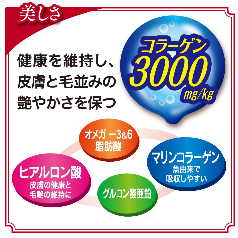 Beer yeast (source of β-glucan), coenzyme Q 10, saccharide (oligosaccharide, erythritol)), fish and shellfish (fish extract powder, marine collagen, small fish powder (DHA, EPA / omega-