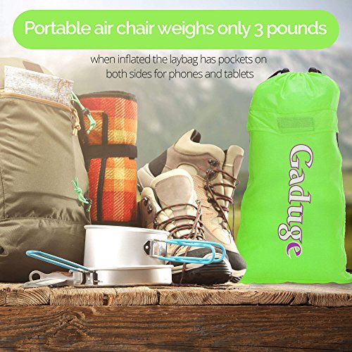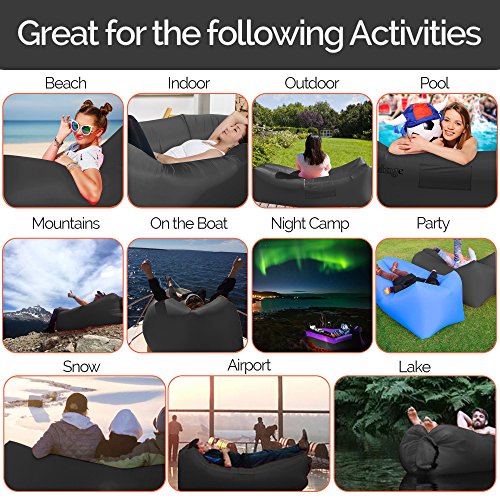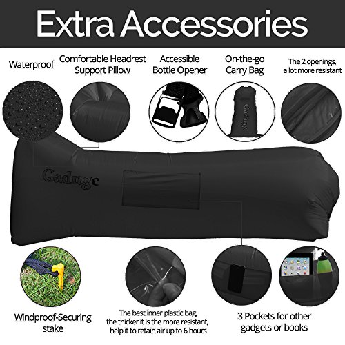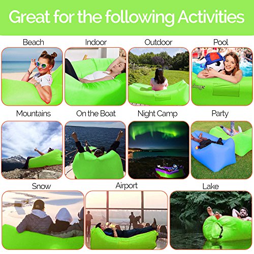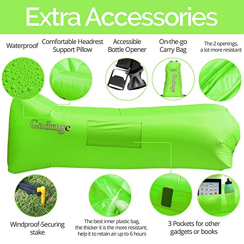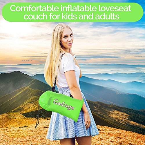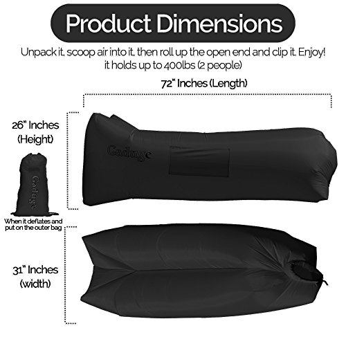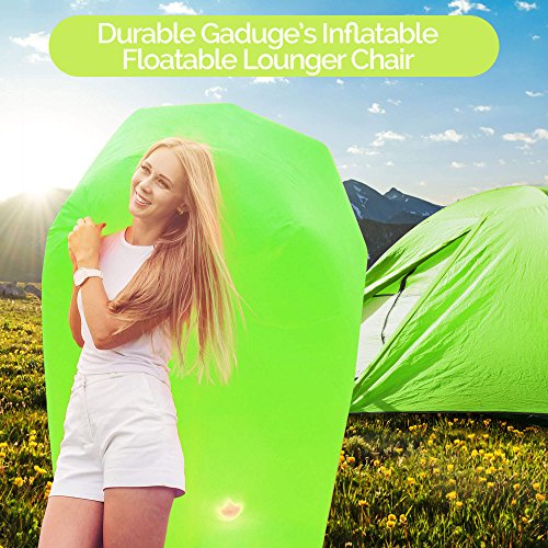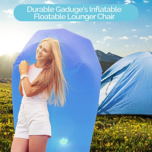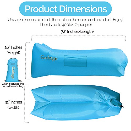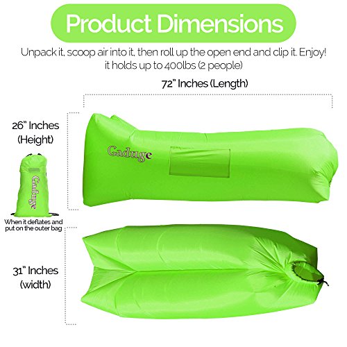 Get the air sofa that combines all the best features in one package. It is everything you wanted: ?? A pool lounger raft for lazy days on the water ?? The inflatable lounge couch that stays inflated long after the show ends ?? A heavy duty inflatable lounger that holds up to 300lbs on all sorts of terrain ?? With pockets for your personal items and an opener for your drinks The Gaduge Hangout Couch is designed for maximum comfort, relaxation, and durability. COMFORT ?? The headrest cradles your head and neck when you are lying down ?? A dual tube design provides better support for your body and retains air for longer ?? Large inflatable lounger expands to 6.89 feet long by 2.3 feet wide, for you and a friend RELAXATION ?? Simple to inflate in seconds, no air pump needed, and no blowing it up with your mouth ?? Lightweight at only 3 pounds, portable and compact for transport ?? Easier to manage than a bulky, heavy folding chair ?? Use it indoors or outside, wherever you want to chill out DURABILITY ?? Smooth ripstop nylon shell resists wet weather and abrasion, and it dries fast ?? Tough double 12 polyethylene liner that retains air and keeps out water This is the hangout lounger worth buying. Unpack it, scoop air into it, then roll up the open end and clip it. Enjoy! We stand behind it with a 100% money-back satisfaction guarantee. 0 |