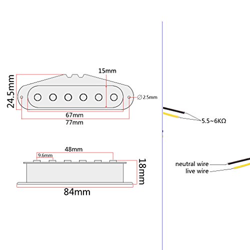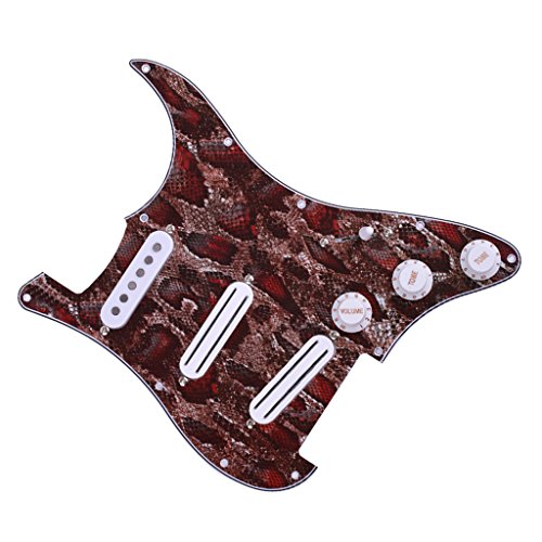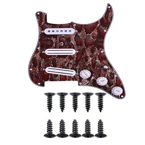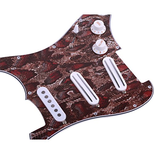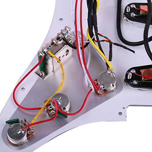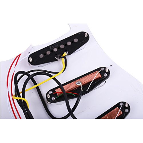 Description: - 3ply Loaded Prewired Guitar Pickguard Scratch Plate with Pickguard Mounting Screws for Electric Guitar Parts. - High quality and brand new. - 1 single-coil Neck Pickup Alnico V and 2 mini humbucker Dual Rail Pickups Middle Bridge Ceramic Magnets. - 1 volume and 2 tone control knobs white and golden number. - 5-way pickup selector toggle switch. - Fit for ST SQ electric guitar replacement.