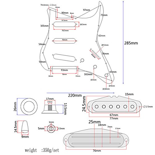 Specification: - Neck single-coil pickup R: 5.0--5.2kohm, alnico 5 - Middle humbucker pickup R: 9.2--9.3kohm - Bridge humbucker pickup R: 9.2--9.3kohm Size Chart: Pickguard(LxW): Approx. 285x220mm / 11.22x8.66inch Screws