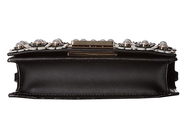 *Fold-over flap with fold-lock closure decorated with pearl and floral applique.