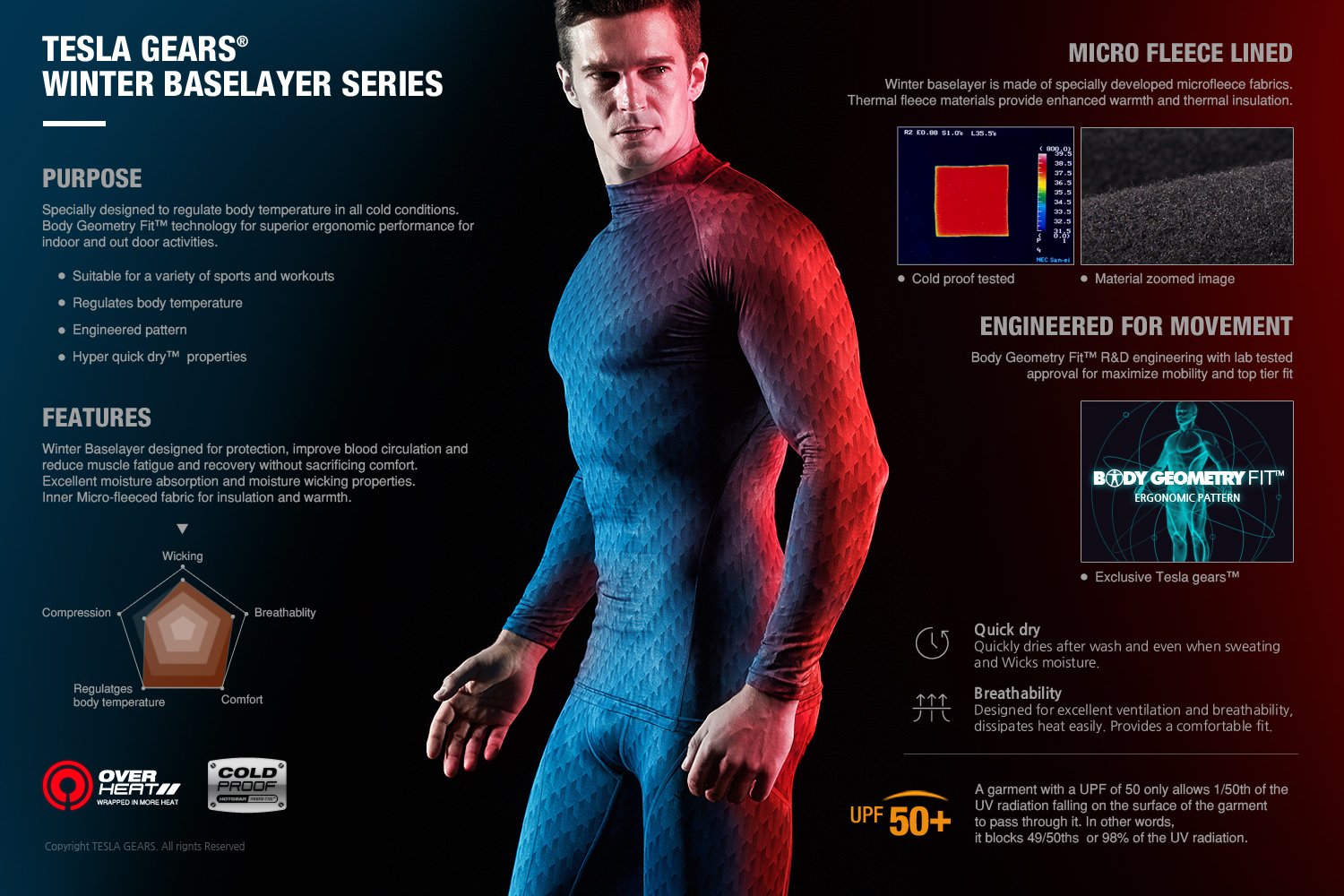 The Over Heat Series are designed to prevent body heat loss and self regulates body times even in the coldest of environments.