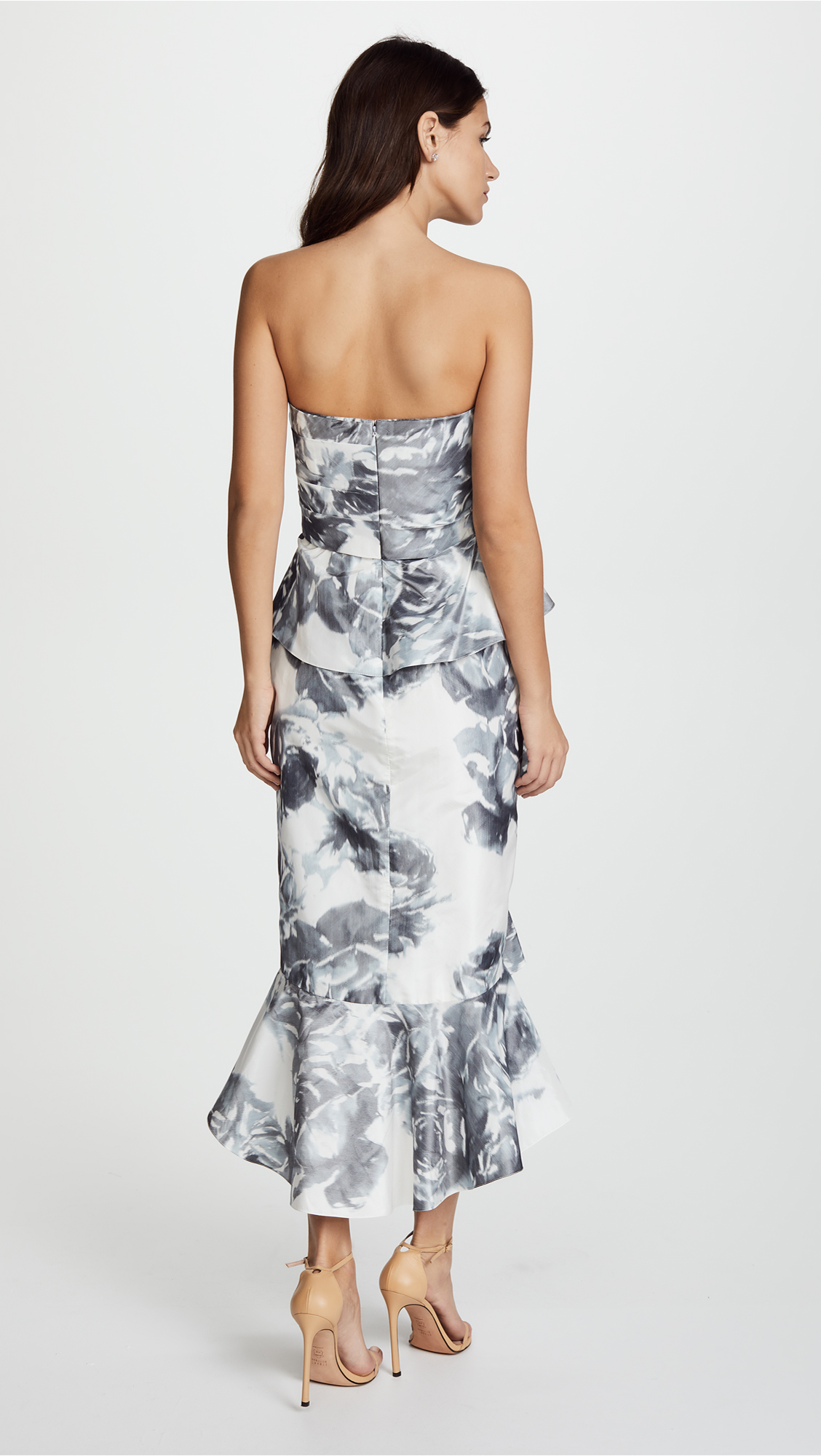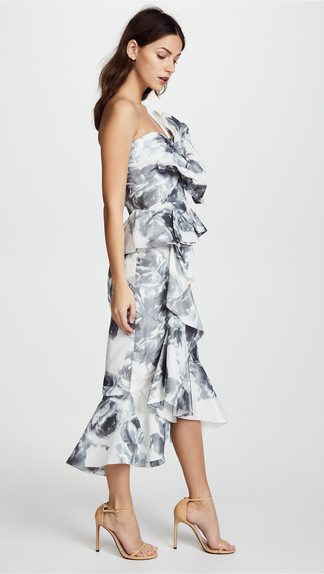 Fabric: Silk taffeta Boned bodice Decorative bow Abstract print Tea Length Strapless Sleeveless Hidden zip at back Hook-and-eye at back Open back Lined Shell: 100% silk Trim: 100% nylon Dry clean Made in the USA Style #MRCHE20196