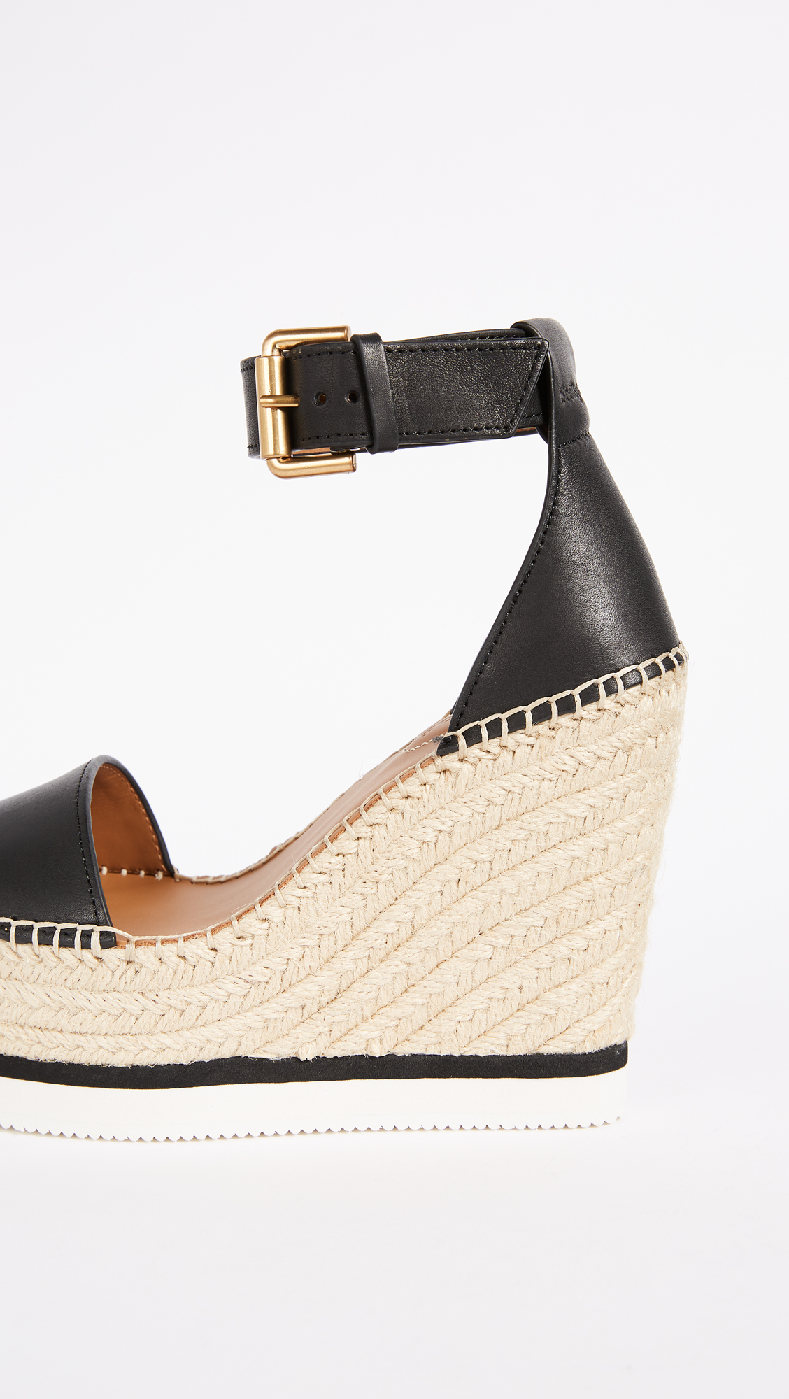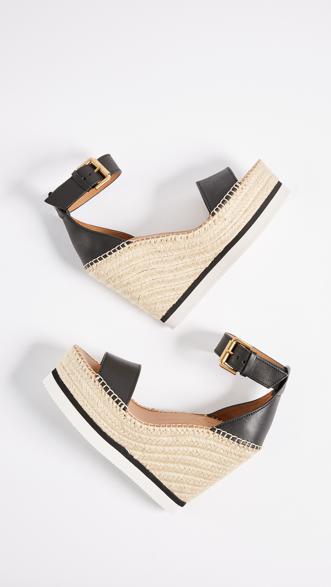 Leather: Calfskin Braided-jute wedgeStriped, foam platform Single-strap style Wedge heel Platform profile Buckle at ankle Open toe Rubber sole Imported, China This item cannot be gift-boxed Style #SEECL41589
