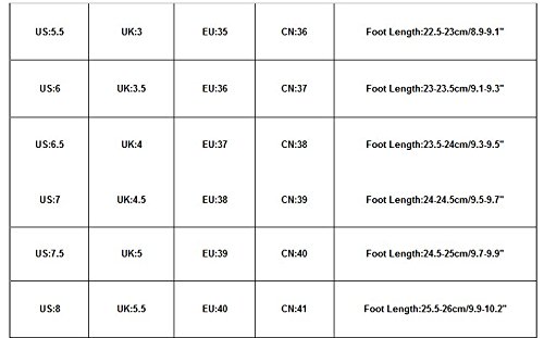 Product DescriptionUS:5.5=====Foot Length:22.5-23cm/8.9-9.1" US:6=====Foot Length:23-23.5cm/9.1-9.3" US:6.5=====Foot Length:23.5-24cm/9.3-9.5" US:7=====Foot Length:24-24.5cm/9.5-9.7" US:7.5=====Foot Length:24.5-25cm/9.7-9.9" US:8======Foot Length:25.5-26cm/9.9-10.2"0
