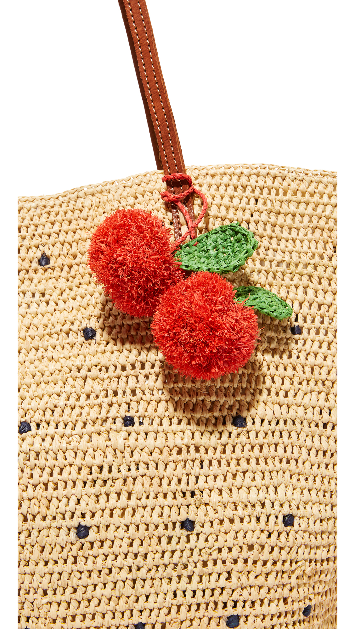 Straw pom-poms and a sparse dot pattern bring charm to this beach-ready Mar Y Sol tote. Magnetic top. Lined, 1-pocket interior. Leather handles.