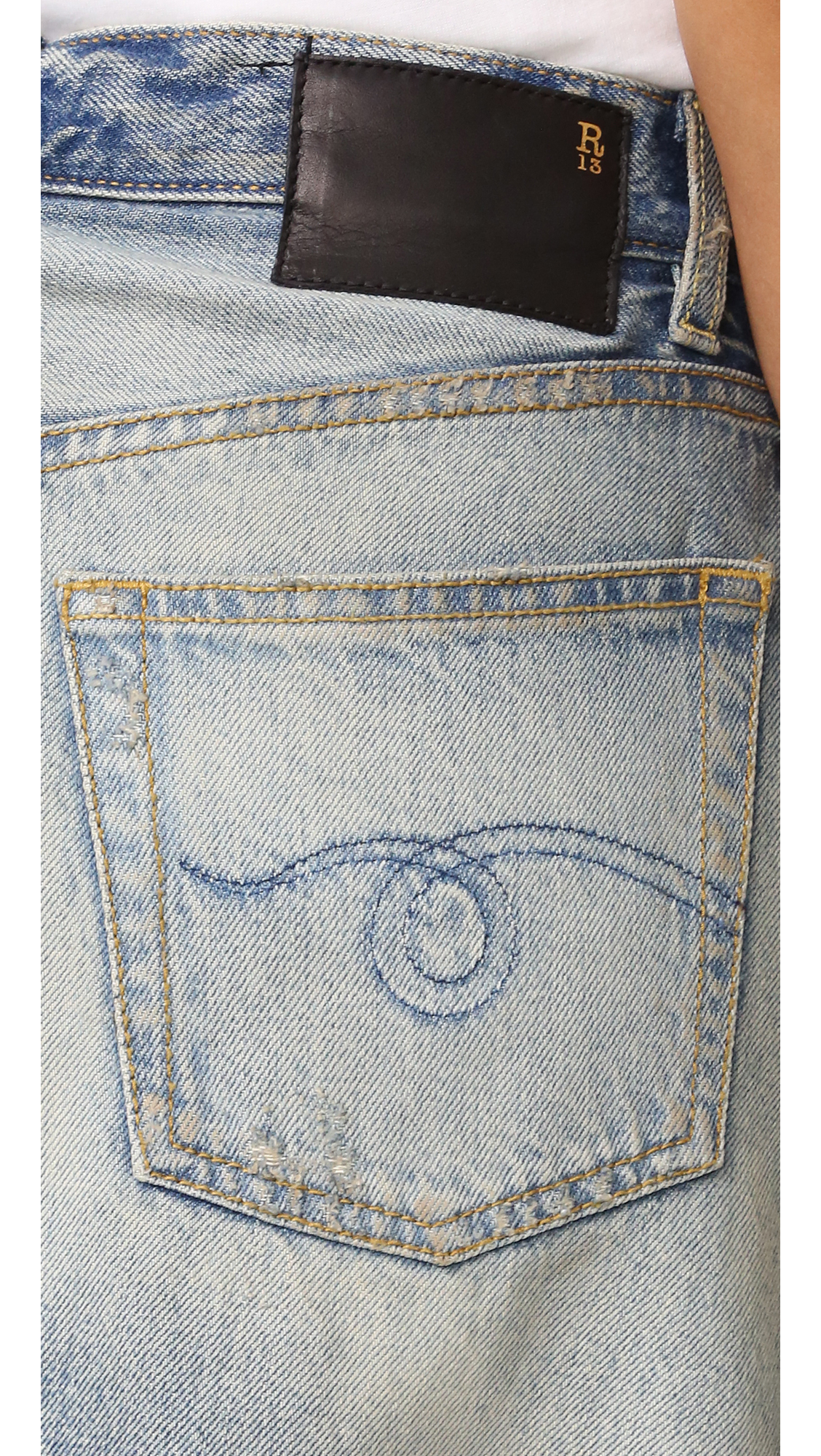 These destroyed R13 jeans have a relaxed fit and are double-layered through the thigh. Frayed cuffs. 5-pocket styling. Single-button closure and zip fly.