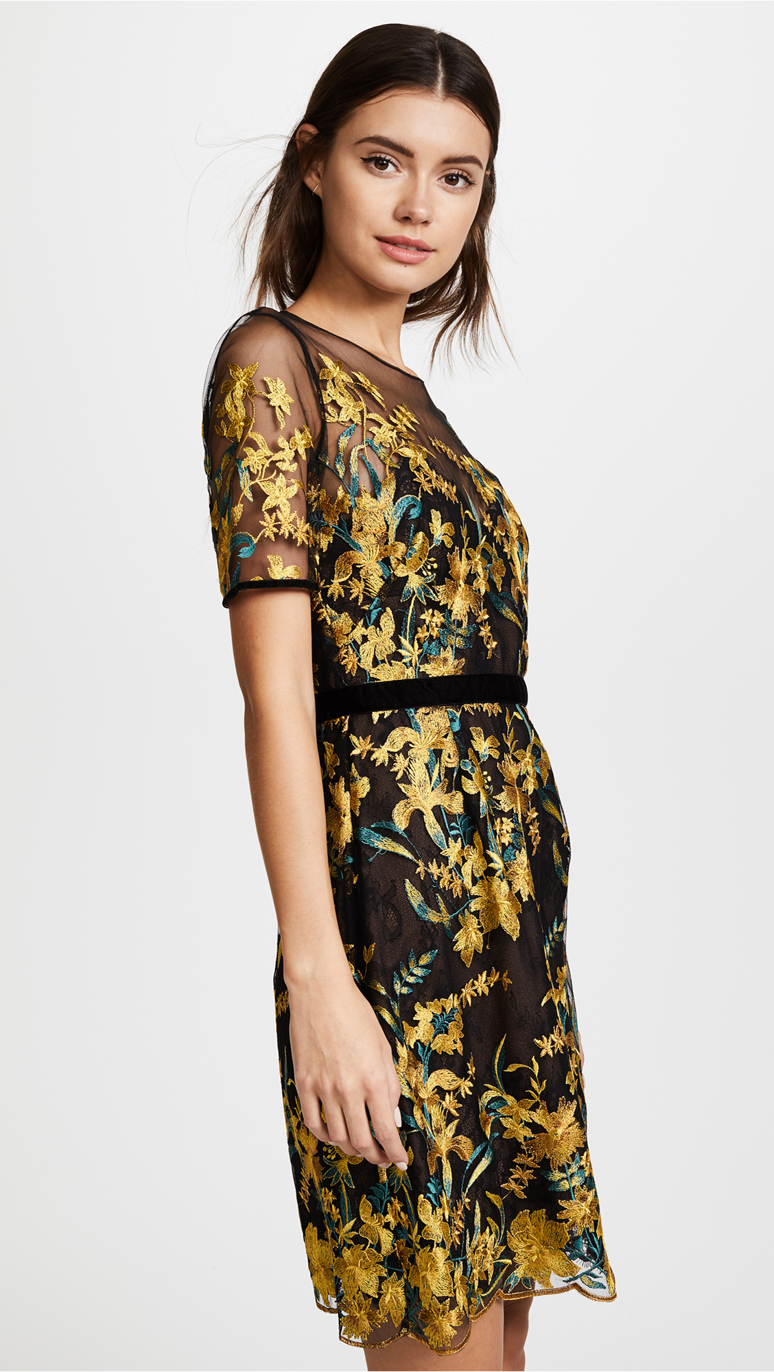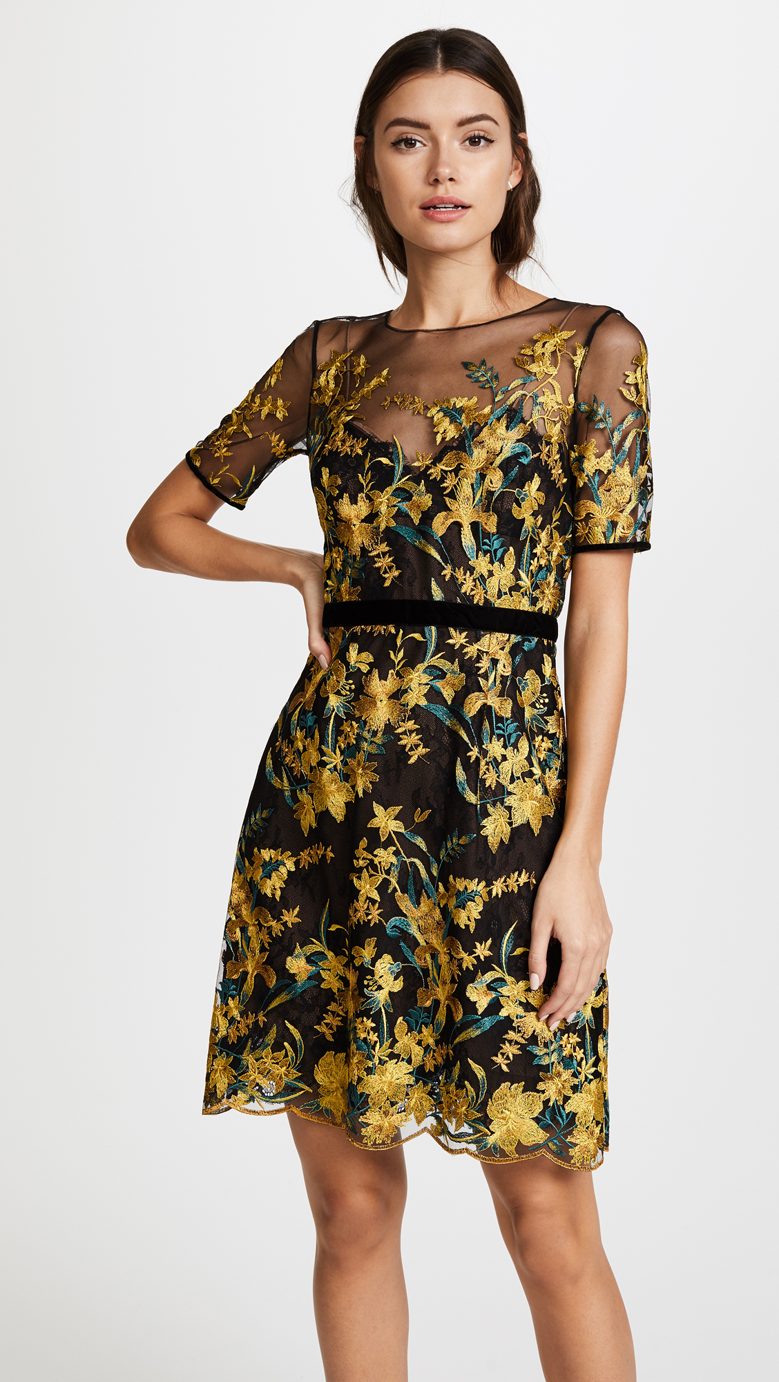 An embroidered Marchesa Notte cocktail dress in layered mesh and lace. The illusion neckline and sheer short sleeves add flirty detail. Scalloped hem. Hidden back zip. Lined.