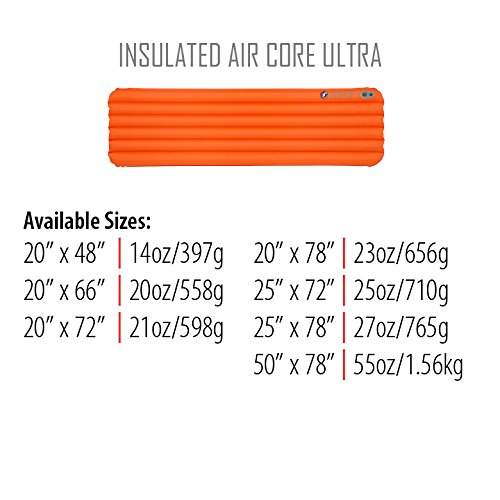Studio : Big Agnes Publisher : Big Agnes Binding : Misc. Product Description New for 2016, the redesigned Air Core Ultra is a smooth and stable sleeping surface, easier and faster to inflate/deflate, warmer, tougher, lighter, and more packable than its award winning predecessor. PETITE: Dimensions: 20" x 66" x 3.25", Rolled size: 4.5" x 8". Weight: 20 oz. REGULAR: Dimensions: 20" x 72" x 3.25", Rolled size: 5" x 8". Weight: 21 oz. LONG Dimensions: 20" x 78" x 3.25", Rolled size: 5" x 8". Weight: 23 oz. WIDE REGULAR: Dimensions: 25" x 72" x 3.25", Rolled size: 5" x 9". Weight: 25 oz. 0