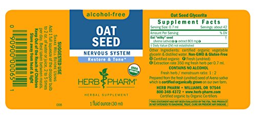 ReleaseDate : 2013-09-20 Studio : Herb Pharm Publisher : Herb Pharm Binding : Health and Beauty Product Description Herb Pharm Oat Seed extract works with the body’s natural mechanisms to support, restore and tone the nervous system*. Herb Pharm prepares Oat Seed from the fresh (undried) seed of Avena sativa which is Certified Organically Grown on the company's own farm. To assure optimal extraction of Oat's bioactive compounds, the seeds are hand-harvested only in their semi-mature ("milky") stage and are then taken directly to the laboratory and promptly extracted while still fresh and succulent. Oat has a very mild taste that is very faintly bitter and earthy. Oat Seed is easily dosed and taken in liquid form. It may be added to water or other liquid for taste and is easily absorbed into the bloodstream. Herb Pharm never uses synthetic solvents. The company's farm is Certified Organic, Bee Friendly, and Salmon Safe. Herb Pharm is the #1 selling liquid herbal extract brand in US Natural Food (SPINS). Herb Pharm is a company of herbalists, scientists, and farmers in GMO-free Josephine County, OR. There, they have been cultivating herbs with care, precision, and respect for nature since 1979. * This statement has not been evaluated by the FDA. This product is not intended to diagnose, treat, cure, or prevent any disease. 0