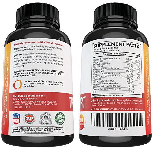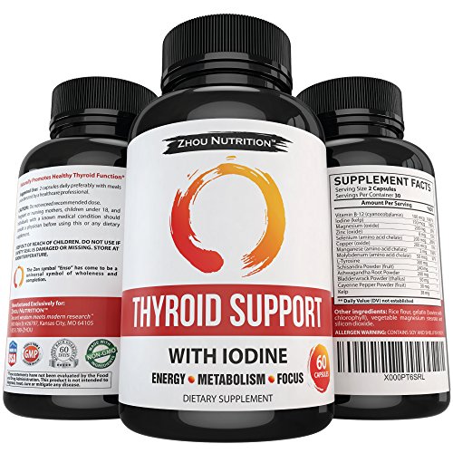 -. Binding : Health and Beauty -. Brand : Zhou Nutrition -. EAN : 0637769765873 -. Feature : BOOST METABOLISM AND LOSE WEIGHT - Our thyroid complex acts as a helper for your thyroid which helps increase metabolism and encourages weight loss. Watch the pounds fall off on your way to a happy and healthier you. / REMOVE THE BRAIN FOG & THINK CLEARLY - Tired of living in a mental fog? You will be amazed at how much better you can concentrate and focus when your thyroid is functioning properly due to our expert blend. Watch your productivity soar as you conquer daily tasks with ease. / WAKE UP RESTED & STAY ENERGIZED ALL DAY - Are you sick and tired of being tired? With our All Natural Thyroid Support, You will wake up rested and stay energized throughout the day by giving your thyroid gland the nutrients it needs. / NATURAL & SAFE ALTERNATIVE - Our formula contains an all natural blend of vitamins, minerals, herbs and amino acids crafted by experts in the field of modern nutritional science. These natural ingredients include: vitamin b-12, iodine, magnesium, zinc, selenium, copper, manganese, molybdenum, l-tyrosine, schizandra, ashwagandha root, bladderwrack, & cayenne pepper. Our formula is safe & effective for both men and women. / 'FEEL LIKE YOUR OLD SELF' GUARANTEE - Return even the empty bottles! We are so confident that you will love our Thyroid Support that we will refund every penny if you don't like it! What do you have to lose? You will either boost your metabolism, think more clearly & feel like your old self again or you will get a full refund. -. Label : Zhou Nutrition -. Manufacturer : Zhou Nutrition -. PackageQuantity : 1 -. ProductGroup : Health and Beauty -. ProductTypeName : HEALTH_PERSONAL_CARE -. Publisher : Zhou Nutrition -. Studio : Zhou Nutrition -. Title : Thyroid Support Complex With Iodine to Improve Energy & Help Lose Weight - Natural Supplement to Increase Concentration, Boost Metabolism & Reduce Brain Fog - 'Feel-Like-Your-Old-Self-Again' Guarantee -. UPC : 637769765873