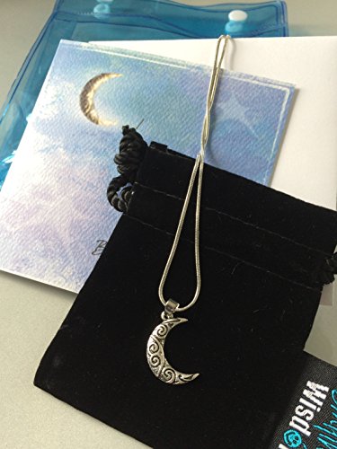 MOON PENDANT - .75 x .55 inch, 16 inch snake chain with 2 inch extender. The pendant has a custom regal smooth dot pattern on the back. This Celtic necklace has an antique silver finish and comes in a black velvet bag lined in satin.