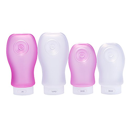4 SILICONE TRAVEL BOTTLES PLUS CREAM JAR; the Vumos Silicone Travel Bottle Set includes four silicone bottles and a cream jar. The set can hold different toiletry products such as your shampoo, body lotion, soap, and one of your many face or body creams!