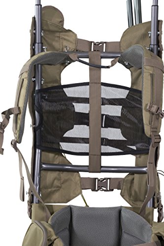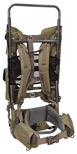 -. Feature : Unique lashing system secures meat for long hauls; Three lashing straps with webbing strap extenders / Freighter shelf supports heavy loads / Adjustable shoulder harness; Padded waist belt and shoulder straps; Mesh back band for better ventilation / Shooting Stix holder; Flashlight and knife pockets; Clevis pin attachment / Aluminum Frame; Weight: 5 pounds 2 ounces; Torso Range: 17" to 23"