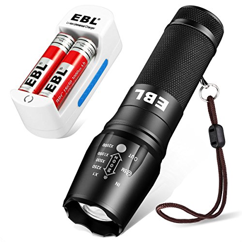 EBL LED Tactical Flashlight - with Zoomable Waterproof function and 18650 Rechargeable BatterIes (2 packs) & Battery Charger