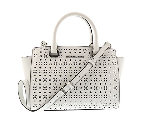 -. Brand : Michael Kors -. Color : Optic White -. Department : womens -. EAN : 0190049472613 -. Feature : Saffiano Leather / Double top handles with 4" drop; adjustable crossbody strap with 21" drop / Silver tone hardware; side gussets; logo plaque at front; Interior features zip pocket and 2 slip pockets / Luxe Saffiano leather shapes this smart satchel with discrete gussets and signature detailing. / Approx. 13" W x 8" H x 4" D -. Label : Unknown -. Manufacturer : Unknown -. Model : Selma -. ProductGroup : Shoes -. ProductTypeName : HANDBAG -. Publisher : Unknown -. Size : Medium -. Studio : Unknown -. Title : MICHAEL MICHAEL KORS Selma Medium Saffiano Leather Satchel (Medium, Perforated White) -. UPC : 190049472613