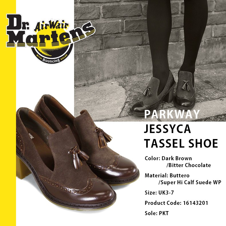 【ポイント5倍】【あすつく不可/メール便不可/代金引換不可】◆Dr.Martens PARKWAY JESSYCA TASSEL SHOE◆ サイドのカットが女性らしいスリッポンタイプのタッセルシューズです。イングチップとタッセルがクラシカルな雰囲気をかもし出すこちらのアイテムは、ブッテロレザーと高品質なカーフスエードを使用し、女性らしさと履きやすさを重視した仕上がりになっています。ヒールは約9.5cmと高めではありますが、がっしりと太く、ラバー素材を使用しているので、滑りにくく履き心地も抜群です。 ※当店はDr.Martens正規取扱店です。並行輸入品ではございません。※撮影は室内で行われており、ライティングにより実物と色味が少し異なる場合がございます。※当商品はメーカー在庫品です。7~10日前後の納期となります。※商品の特性上、不良品以外の返品及び交換、出荷後のキャンセルはお受けできません。予めご了承下さいます様、宜しくお願い申し上げます。■素材…Buttero/Super Hi Calf Suede WP■ブランド…Dr.Martens■商品コード…HI-16143201-IK