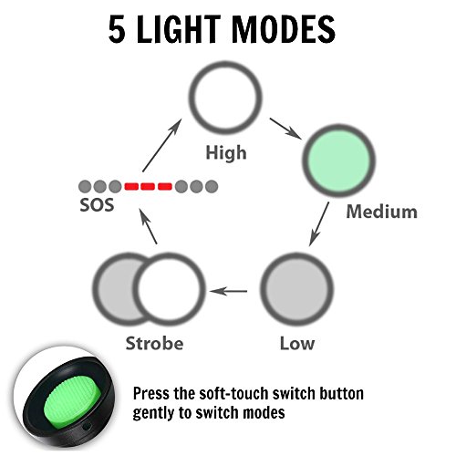 - 5 LIGHT MODES & ZOOM FUNCTION: Full Brightness, Medium Brightness, Low Brightness, Strobe Brightness, SOS. Adjustable focus for close or long range. Functions as a spotlight that throws an intense beam of light up to 600 feet ahead or compact small floodlight that brings illumination to a wide area.