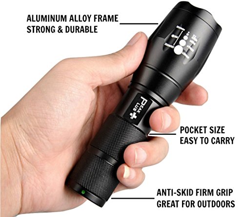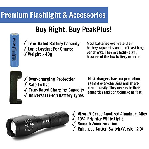 PeakPlus Super Bright LED Tactical Flashlight Zoomable Adjustable Focus 5 Modes Water Resistant Torch with Rechargeable 18650 Lithium Ion Battery & Charger