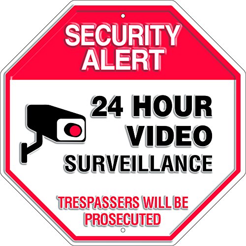 Video Surveillance Sign – No Trespassing Security Alert 24 Hour CCTV Camera – Embossed Metal 11.5 x 11.5 Inches