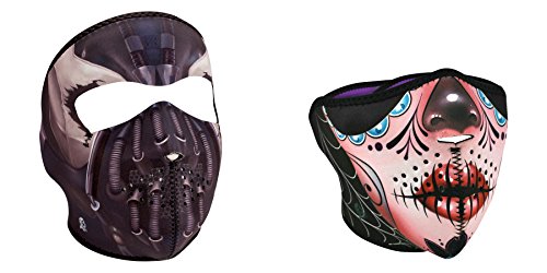 -. Feature : This Product is a 'Bundle' of 2 Neoprene Face Masks identified as a 'Pain' and a 'Sugar Skull' / The First Facemask is the ZanHeadgear 'Pain' Full Face Neoprene Face Masks / The Second Facemask is the ZanHeadgear 'Sugar Skull' Half Face Neoprene Face Mask / These Face Masks / Ski Mask are made of Durable, Naturally Warm & Water Resistant Neoprene Face Mask Material / The Mask Sizes are adjustable, by up to 2 inches, using the Hook & Loop closure, located at the back of the head