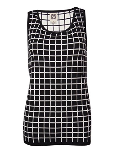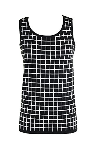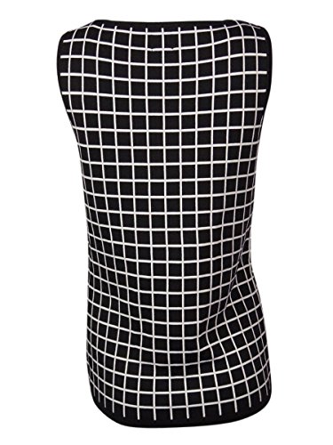Top features no lining, round neck, sleeveless, window pane pattern knit fabric, and pullover style.