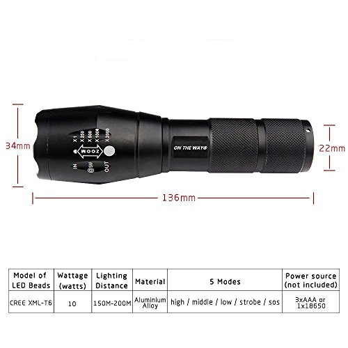 -. Binding : Misc. -. Brand : ON THEWAY -. Color : Black -. EAN : 0704298545464 -. Feature : Lamp Life: Approx 100000 h ;Material: High quality 6061-T6 Aluminum / 5 Mode: high / middle / low / strobe / sos / Adjustable focus range for different usage, stretching to adjust its focus / Switch: Press Tail-cap on/off,Power by: 1x 18650 3.6v/3.7v or 3X AAA battery(Battery not included) / Water resistant design,A perfect item for outdoor sports , Such as Climbing -. Label : ON THEWAY -. Manufacturer : ON THEWAY -. ProductGroup : Home Improvement -. ProductTypeName : TOOLS -. Publisher : ON THEWAY -. Studio : ON THEWAY -. Title : ON THE WAY®2000 Lumen Handheld Flashlight LED XML T6 Water Resistant Camping Torch Adjustable Focus Zoom Tactical Light Lamp for Outdoor Sports Camping Hiking Etc Powered By 1x 18650 Or 3x AAA Battery -. UPC : 704298545464