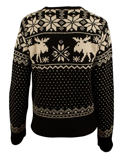88% Merino Extrafine Wool, 12% Alpaca, Women's knit wool pullover sweater, crewneck, features a snowflake and reindeer pattern, dry clean only