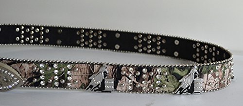 -. Binding : Apparel -. Brand : Stony West -. Color : Green -. Department : womens -. Feature : The entire belt strap is beautifully designed on riveted silver tone metal barrel racer conchos, small rhinestone and studs section interchanging trthrough out the bel / Edges of the belt is intricately designed with beaded trims / Removable polished silver tone floral etched buckle set with Sparkling crystal rhinestones / M - L XL -. PackageQuantity : 1 -. ProductGroup : Apparel -. ProductTypeName : ACCESSORY -. Title : Camouflage Camo Rhinestone Barrel Racer Concho Cowgirl Buckle Belt M L XL