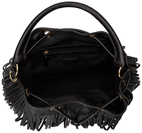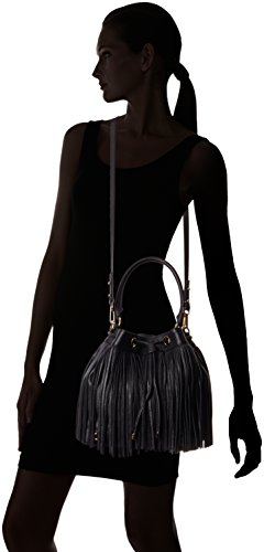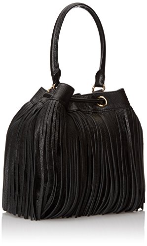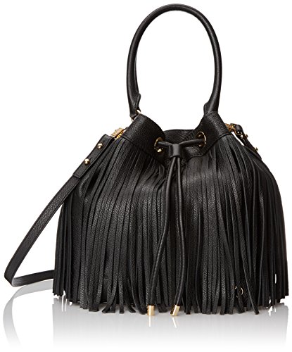 -. Feature : Fringy handbag featuring reinforced bottom and bucket-inspired drawstring closure with gold-tone grommets and aglets / Single top handle and removable cross-body strap