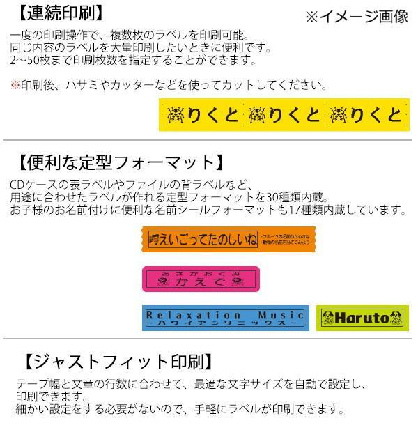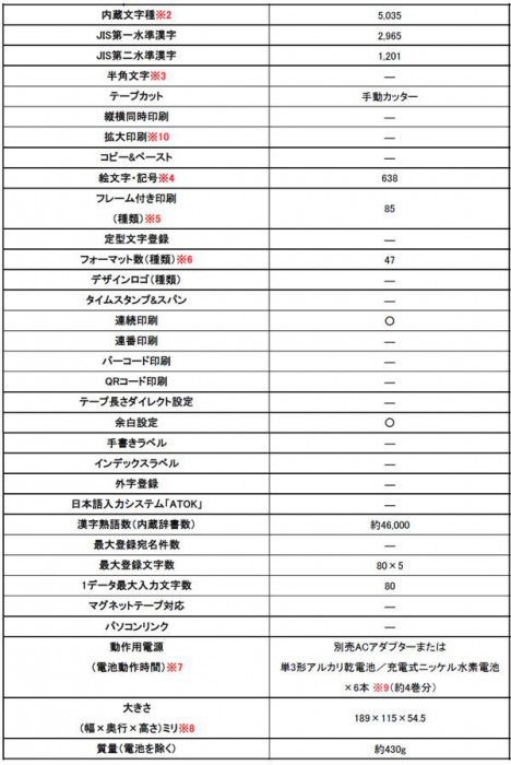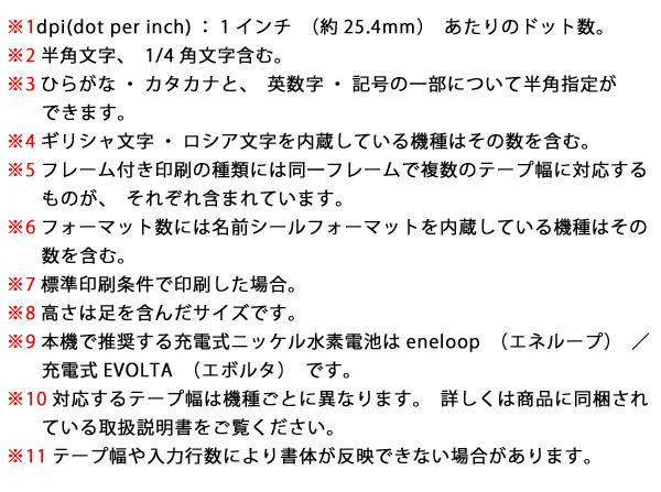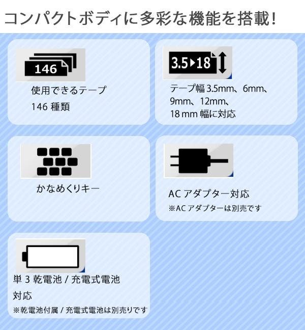 | 付属品 | お試し用単3形アルカリ乾電池6本、お試し用テープカートリッジ(9mm幅×4m)×1、取扱説明書(保証書付・保証期間1年間)、別売品カタログ |