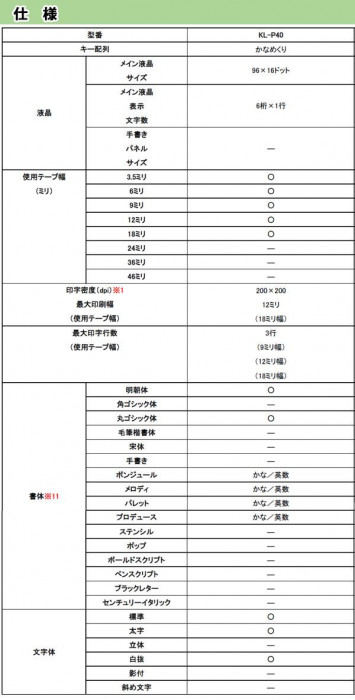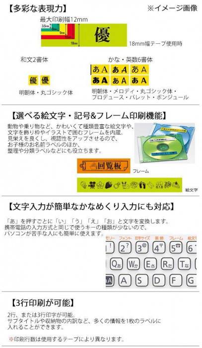 | 漢字2書体、かな6書体、英和6書体とフォントが充実!!12ミリ幅印刷・3行印刷が可能。 |